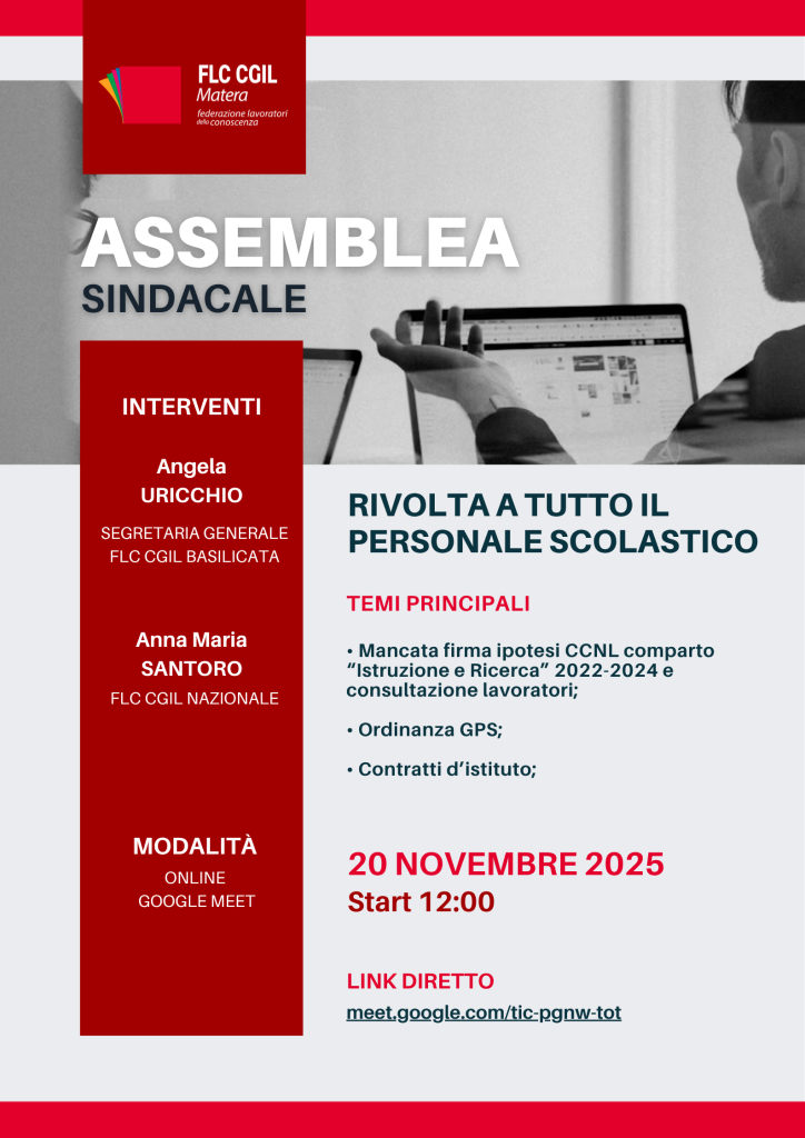 La FLC CGIL della Provincia di Matera indice l’ASSEMBLEA SINDACALE il giorno giovedì 20 novembre 2025 in modalità online rivolta a tutto il personale scolastico in servizio presso tutti gli istituti scolastici della Provincia di Matera.