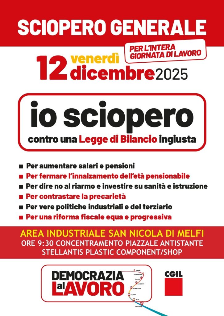 Per la regione Basilicata, il 12 dicembre presidio e corteo a San Nicola di Melfi, a partire dalle ore 09:30 presso il piazzale antistante Stellantis Plastic Component\Shop.